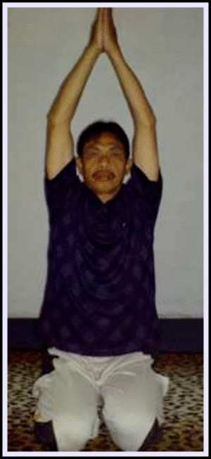diangkat ke atas kepala, telapak tangan bagian dalam saling bersentuhan. Sambil